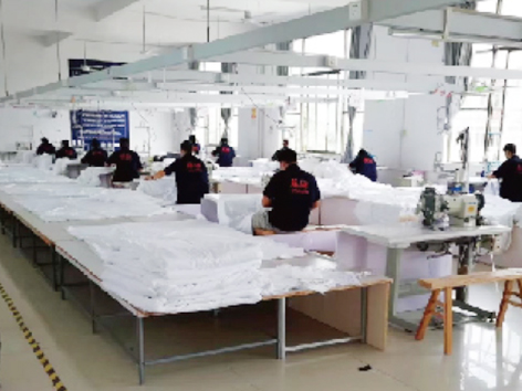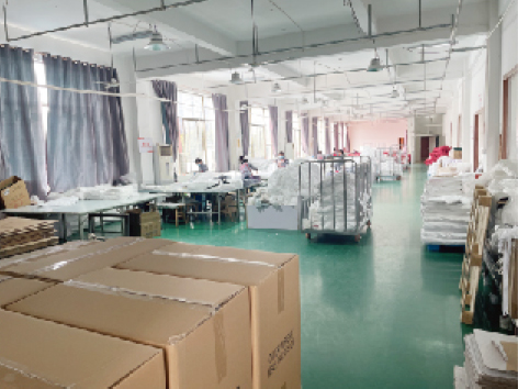 Tilojen osalta tehtaallamme on 8 000 neliömetrin standardoitu tuotantokanta, joka on varustettu 12 tuotantolinjalla ja kattaa koko prosessin kankaan kutomisesta ja leikkauksesta ompelemiseen ja valmiiden tuotteiden tarkastukseen. Olemme tuoneet maahan saksalaisia karstauskoneita ja japanilaisia tarkkuusompelulaitteita, joiden päivittäinen tuotantokapasiteetti on 500 vuodevaatteet ja 2 000 peittoa.