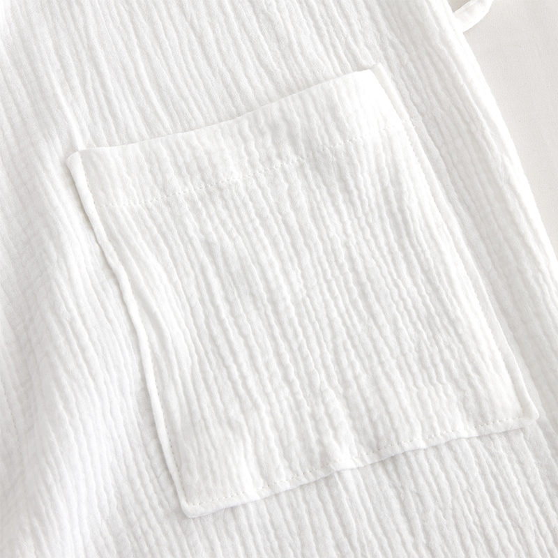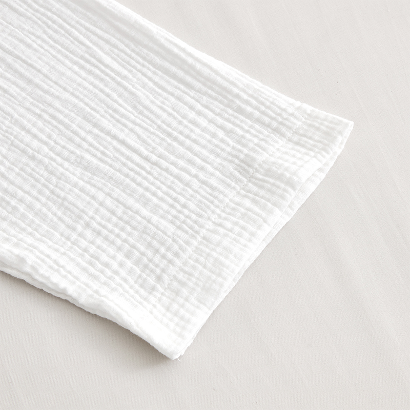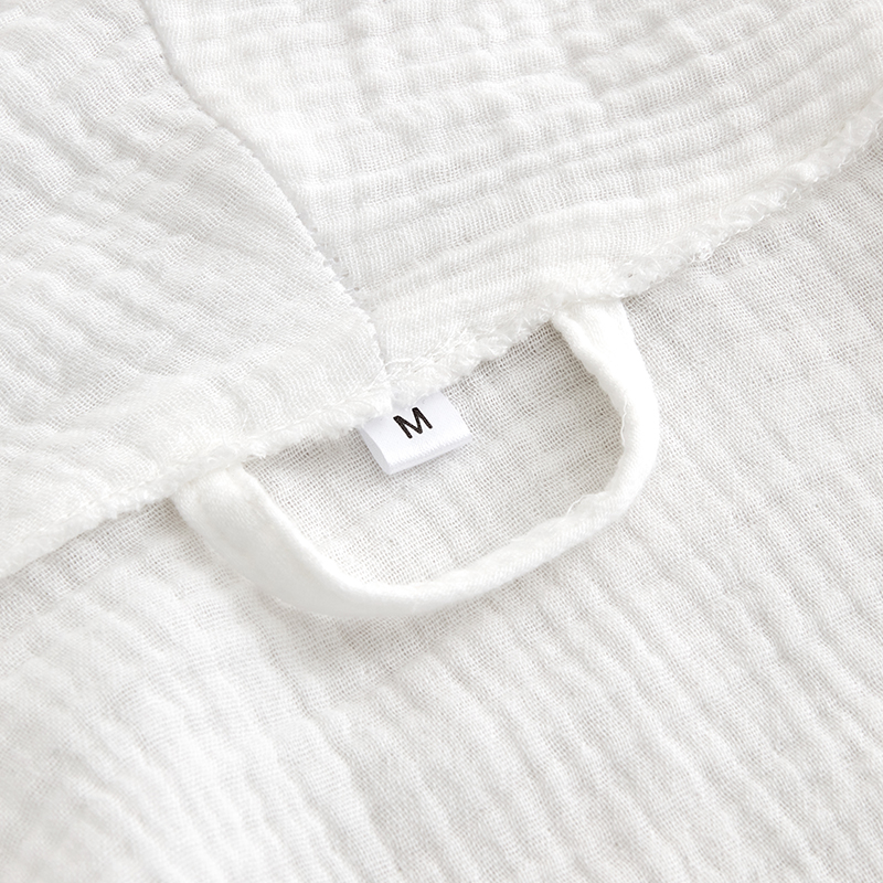 Kylpytakimme on valmistettu kaksikerroksisesta sideharsopuuvillasta. Harsokankaan ainutlaatuinen löysä kudos mahdollistaa esteettömän ilmavirran kahden kerroksen välillä luoden hengittävän kankaan, joka varmistaa mukavuuden kaikissa ilmastoissa ja estää ylikuumenemisen. Puuvillan luontainen ominaisuus on, että siitä tulee uskomattoman pehmeää ajan myötä, jolloin se tuntuu sileältä kuin pilvi ihoa vasten. Kaksikerroksisesta rakenteestaan ​​huolimatta kangas pysyy kevyenä. Se on luonnollisesti imukykyinen ja siirtää tehokkaasti kosteutta pois jättäen ihon raikkaan ja kuivan tunteen kylvyn jälkeen. Valmistettu 100 % luonnollisista puuvillakuiduista, sideharsokankaamme on hypoallergeeninen eikä sisällä vahvoja kemikaaleja, joten se sopii kaikille ihotyypeille, myös herkälle iholle. Vahvistetut ompeleet kaikissa saumoissa ja kauluksissa takaavat kylpytakin kestävyyden ja kyvyn kestää säännöllistä käyttöä ja kaupallista pesua. Leveä, itse valmistettu vyötärönauha, jossa on strategisesti sijoitetut lenkit, tarjoaa turvallisen ja räätälöidyn istuvuuden kaikille vartalotyypeille.